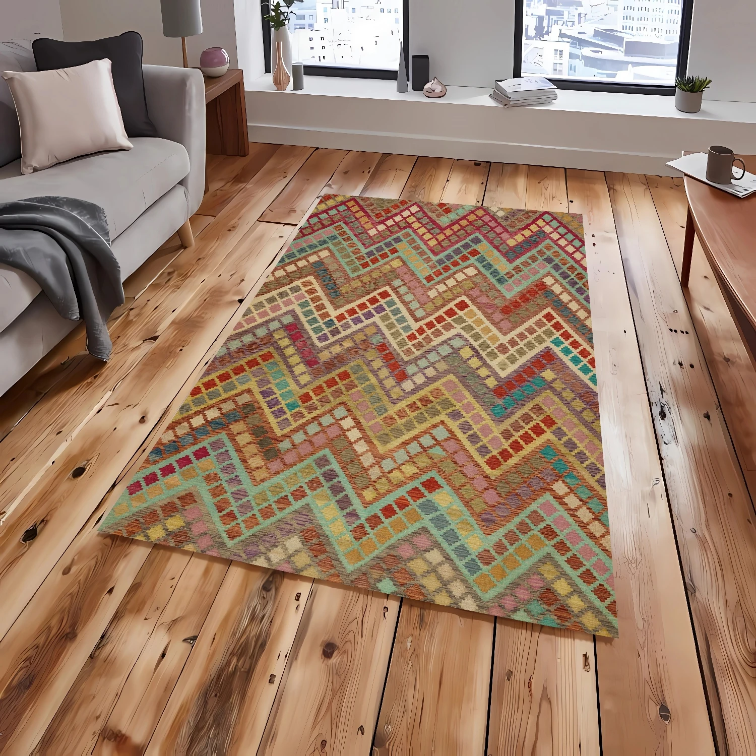 Renkli Zikzak Desen Şönil Dokuma Pamuklu Etnik Halı PTLN 02085(01)